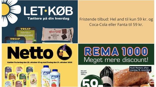 Rema 1000 har et godt tilbud på en hel dybfrossen and, 2400 g, til kun 59 kr. Tilbuddet gælder fra søndag den 26. oktober til og med lørdag den 1. november.